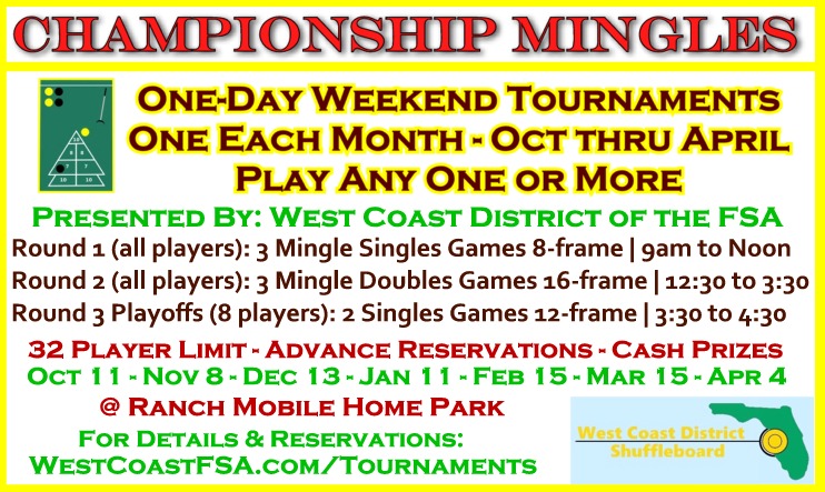 Except the two 'Open' events, all events are restricted to players who reside in the West Coast District (Pinellas County, southwestern Pasco County, and a small portion of Hillsborough County) and are members of a WCD member club, including St Pete Shuffleboard Club, Clearwater Shuffleboard Club, Pinellas Park Senior Center, and many mobile home parks.. WCD club membership is available at event sign-in. All players from anywhere are welcome to play either or both the 'Open' Events, February and April.