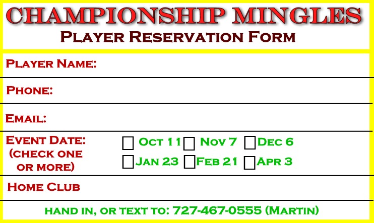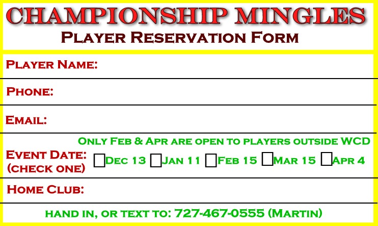 Tournaments are limited to 32 players - use the Advance Reservation form below to reserve your spot. For all tournaments, reservation priority is given to players who have not yet played a WCD Championship Mingles this season if their Advance Reservation is received at least 7 days before the tournament.