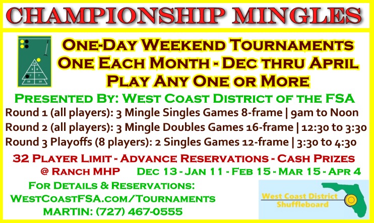 Except the two 'Open' events, all events are restricted to players who reside in the West Coast District (Pinellas County, southwestern Pasco County, and a small portion of Hillsborough County) and are members of a WCD member club, including St Pete Shuffleboard Club, Clearwater Shuffleboard Club, Pinellas Park Senior Center, and many mobile home parks. WCD club membership is available at event sign-in. All players from anywhere are welcome to play either or both the 'Open' Events, February and April.