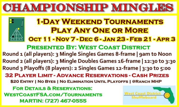 The tournaments are restricted to players who reside in the West Coast District (Pinellas County, southwestern Pasco County, and a small portion of Hillsborough County) and are members of a WCD member club, including St Pete Shuffleboard Club, Clearwater Shuffleboard Club, Pinellas Park Senior Center, and many mobile home parks. WCD club membership is available at event sign-in.